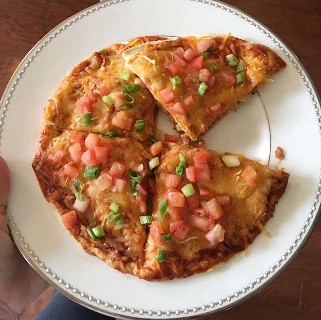 - Spread a thin layer of enchilada sauce on the top of each tortilla. Sprinkle with shredded cheese, evenly dividing it among the four pizzas. Bake in preheated oven for 5-7 minutes, or until the cheese is melted.