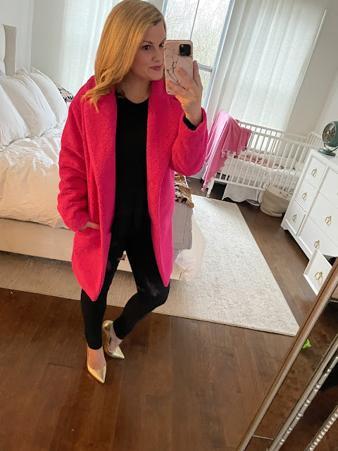 My two outfits from last week, otherwise I was in pajamas or yoga pants 🙂 This teddy bear fleece has been my most worn item of this year, it’s so warm and soft but still looks polished on the outside so it can be dressed up or down.
