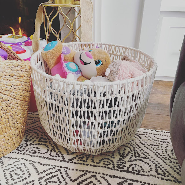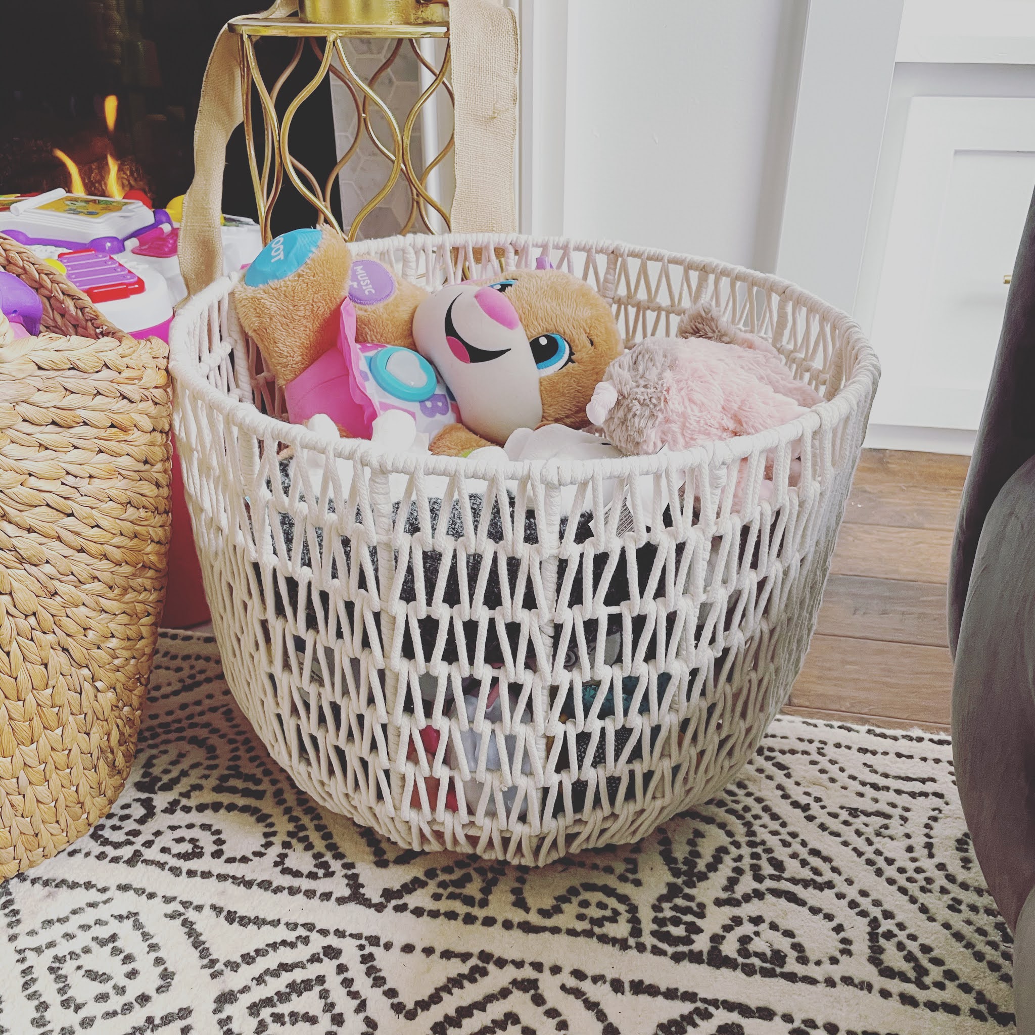 I have been slowly trying to get things organized around this house. Last week when I was in Target I spotted this rope basket, and knew I needed it for all the extra toys we accumulated from Christmas and Reese’s birthday! Man, I totally forgot all of the toys that it takes to keep a toddler entertained! They only had one left at our store so I just ordered a few more in preparation for organizing our for upstairs playroom.