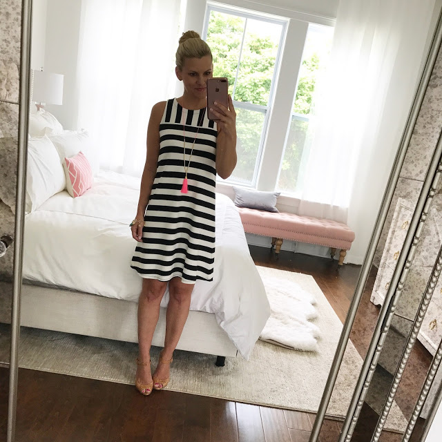 Loft is currently offering 50% off all dresses, tees, tanks, and cropped pants!! And my stripe dress worn below is now only $34!!!