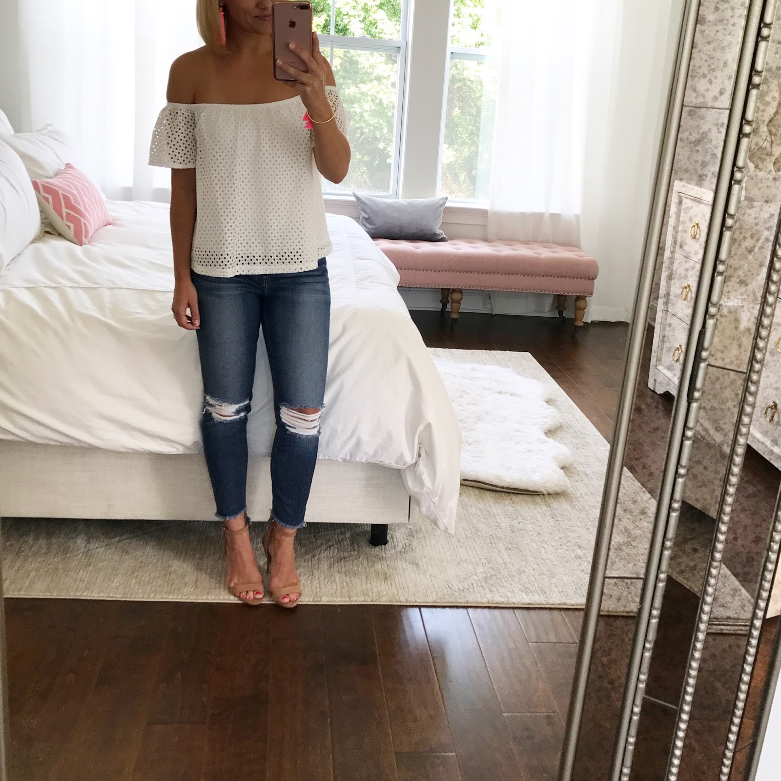 Off the Shoulder Top (only $39) // Jeans // Sandals // Bracelet // Earrings