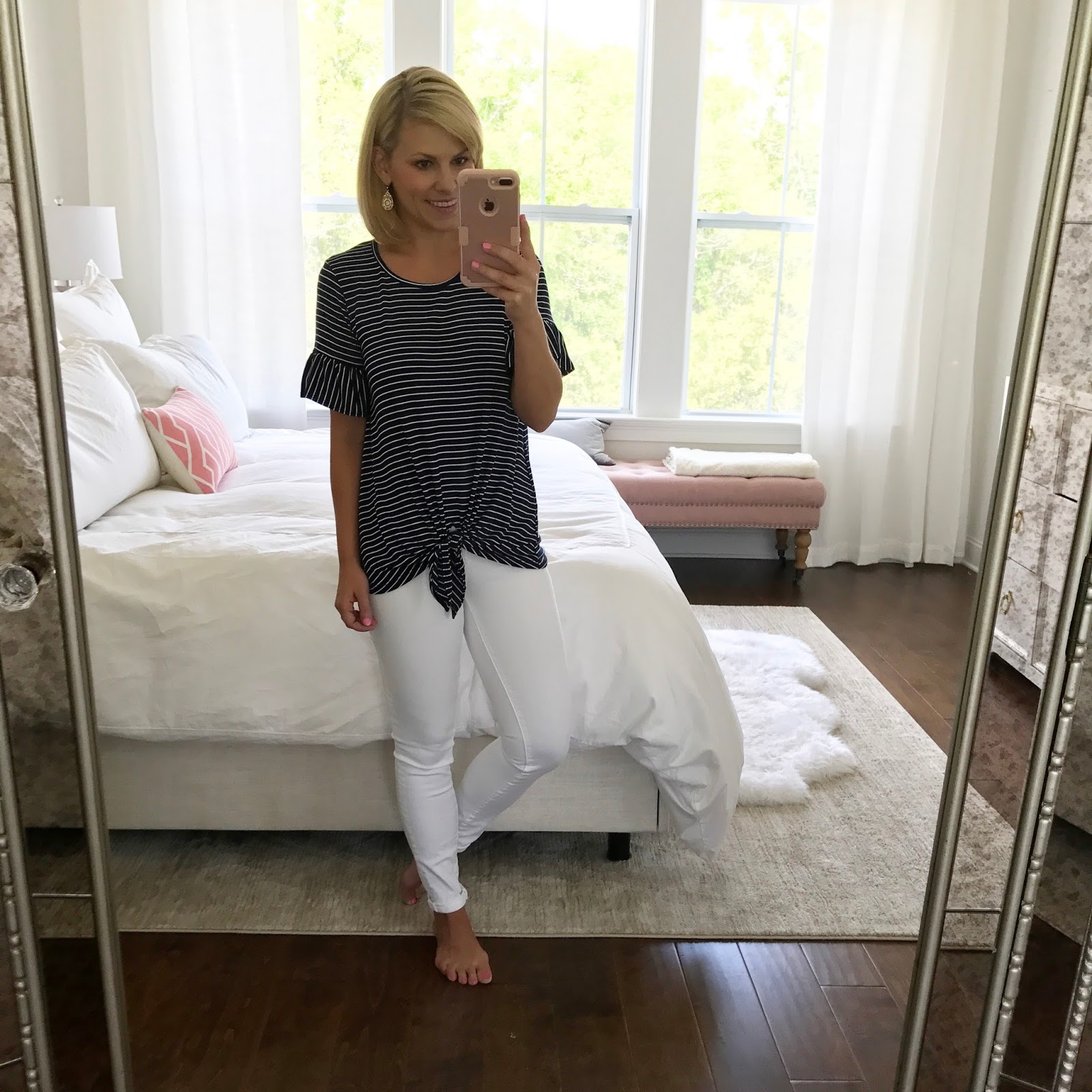 I have had a few reader requests for some petite friendly good white jeans. The jeans I’m wearing below are some of my favorites and the price point is so good, but I do still have to cuff them.