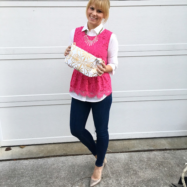 Lace Peplum Top // Poplin Shirt // Jeans // Necklace // Pumps