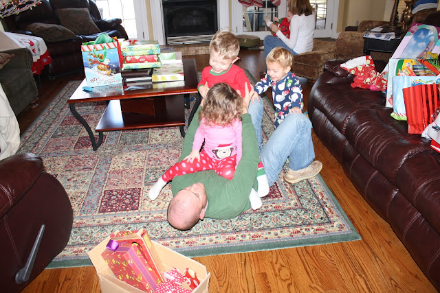 Christmas Eve at my parents, where all the babies decided after presents to tackle uncle Dane 🙂 I just love watching these three together!