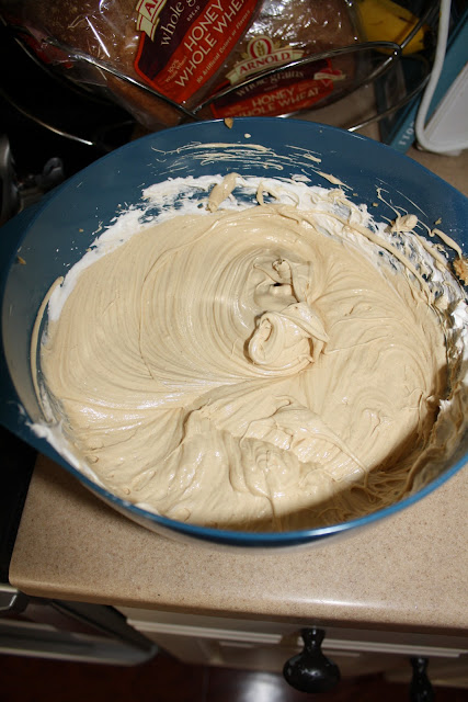 Beat the peanut butter with the cream cheese until smooth. Add powdered sugar and beat until smooth. Add in the thawed Cool Whip and beat mixture until smooth, scraping the sides as needed.