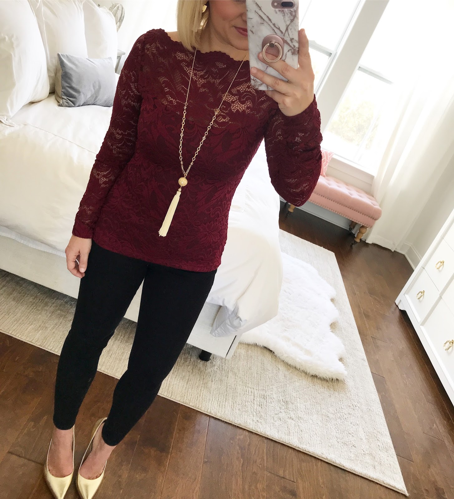 Lace Boatneck Blouse // Jeans (40% off) // Necklace // Earrings // Pumps