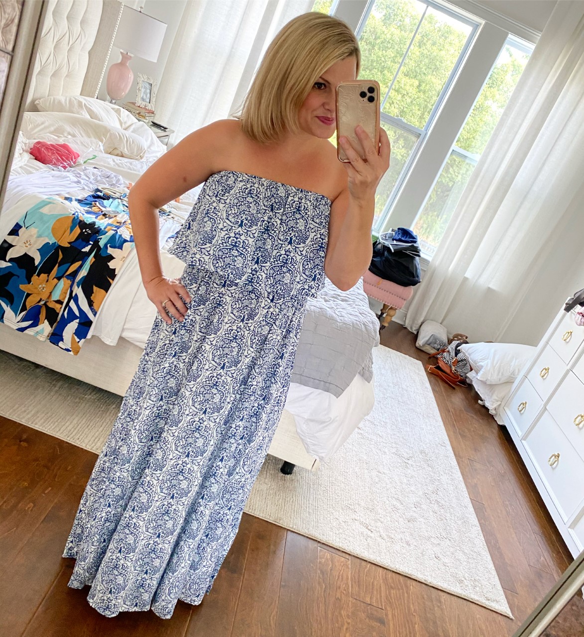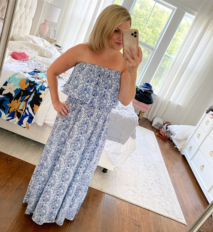 This maxi is so comfy and lightweight, plus, I am loving the classic blue and white pattern. That being said, if blue and white aren’t your thing it also comes in ten other colors and patterns…and it’s also under $30! It runs tts, and for reference, I’m wearing a medium.