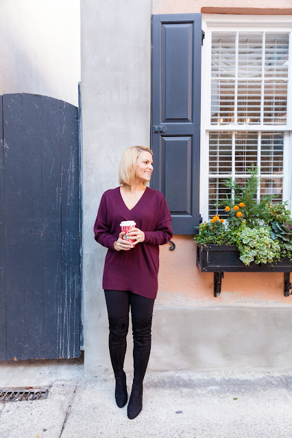 Sweater Knit Tunic (runs big and under $50) // Spanx Leggings run tts) // Over the KneeBoots // Sole Society Tote // Necklace // Earrings // Bracelet // Bracelet