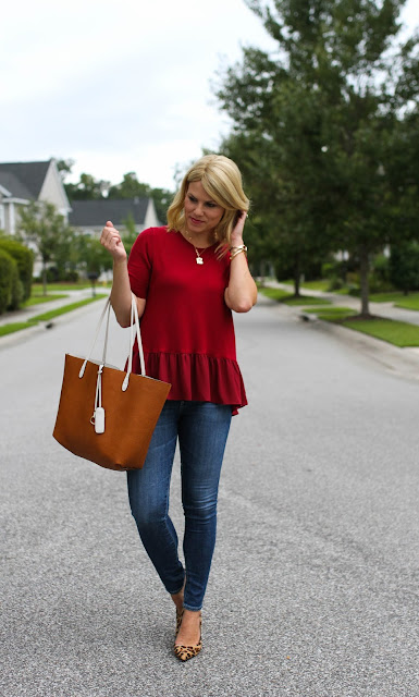 Necklace c/o // Ruffle sweater tee (50% off) // Jeans // Tote // Pumps (look for less here) // Watch // Bangles c/o // Bracelet