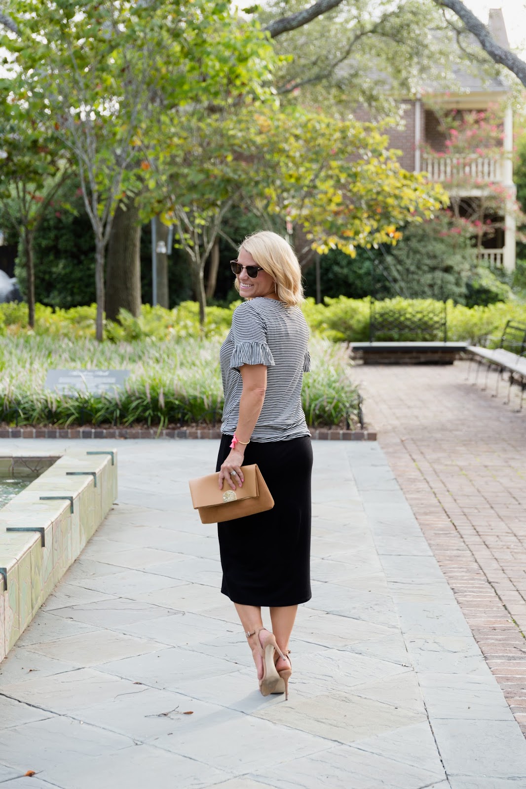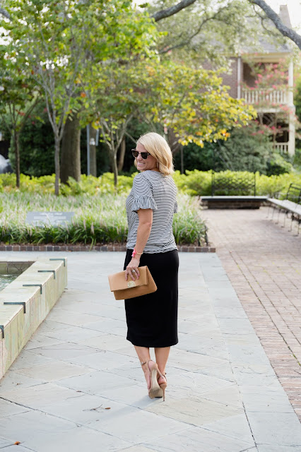 It’s also great for layering with any cute top. I especially love this one with the stripes, tie front, and adorable ruffle sleeves.