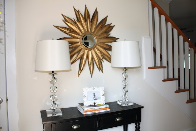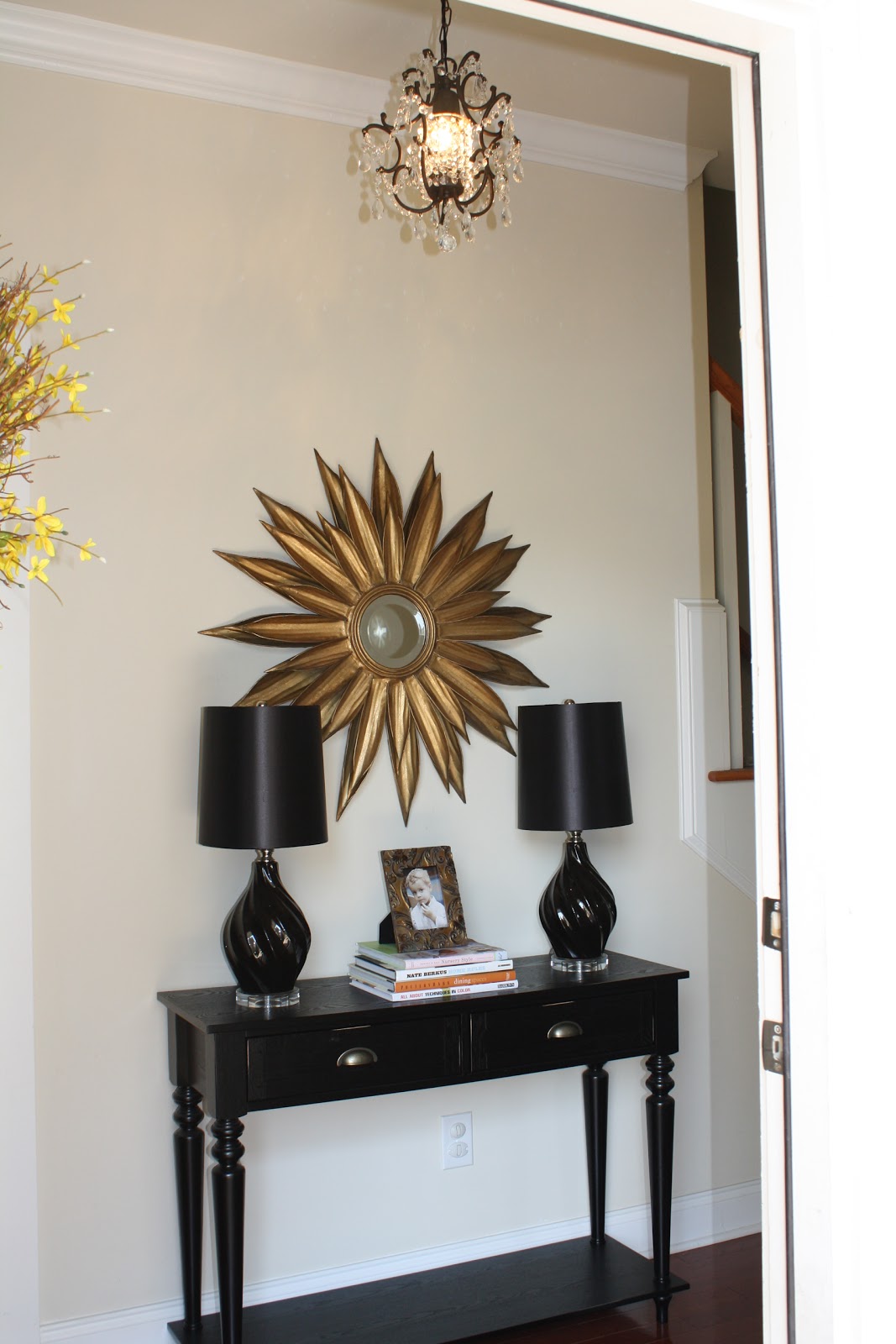 I really like the glass lamps. I would raise your sunburst mirror a little bit and it would be perfect:)