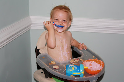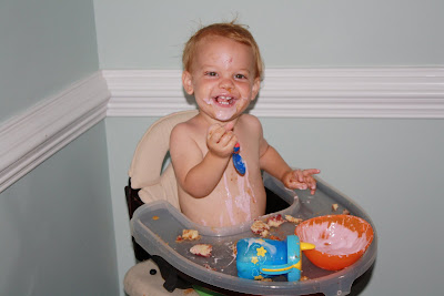 This statement could not be more true……. especially when you see the pictures above! This is about how Carson looks every night during dinner! he demands he feed himself and wants NO help! and my husband has the nerve to ask why I need the cleaning ladies to start coming more often ha!