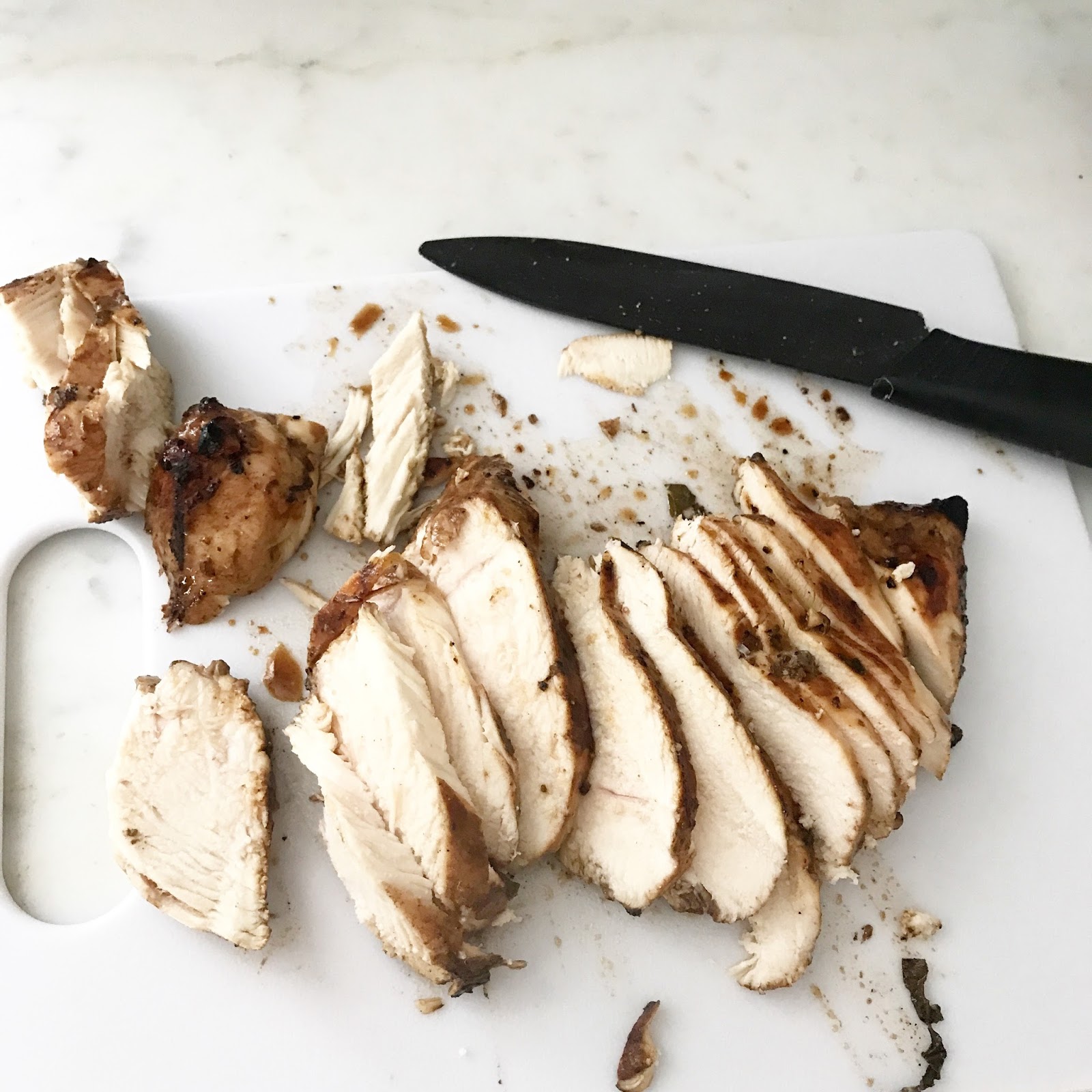- Once the chicken is grilled, slice it up and place on top of the zoodles.