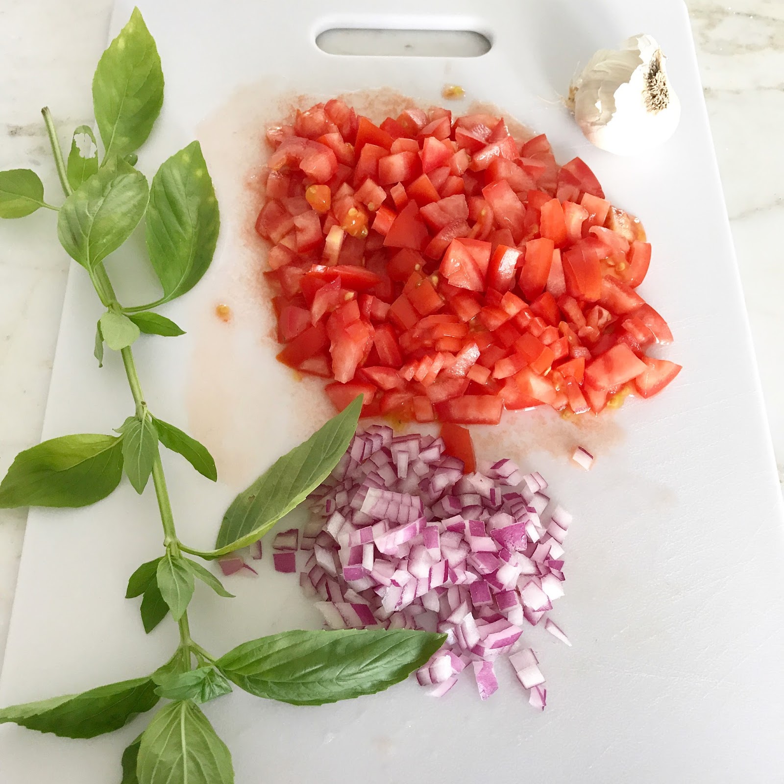 - Before grilling the chicken, combine all of the tomato basil bruschetta ingredients in a medium bowl.