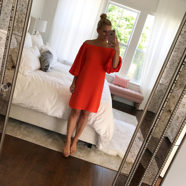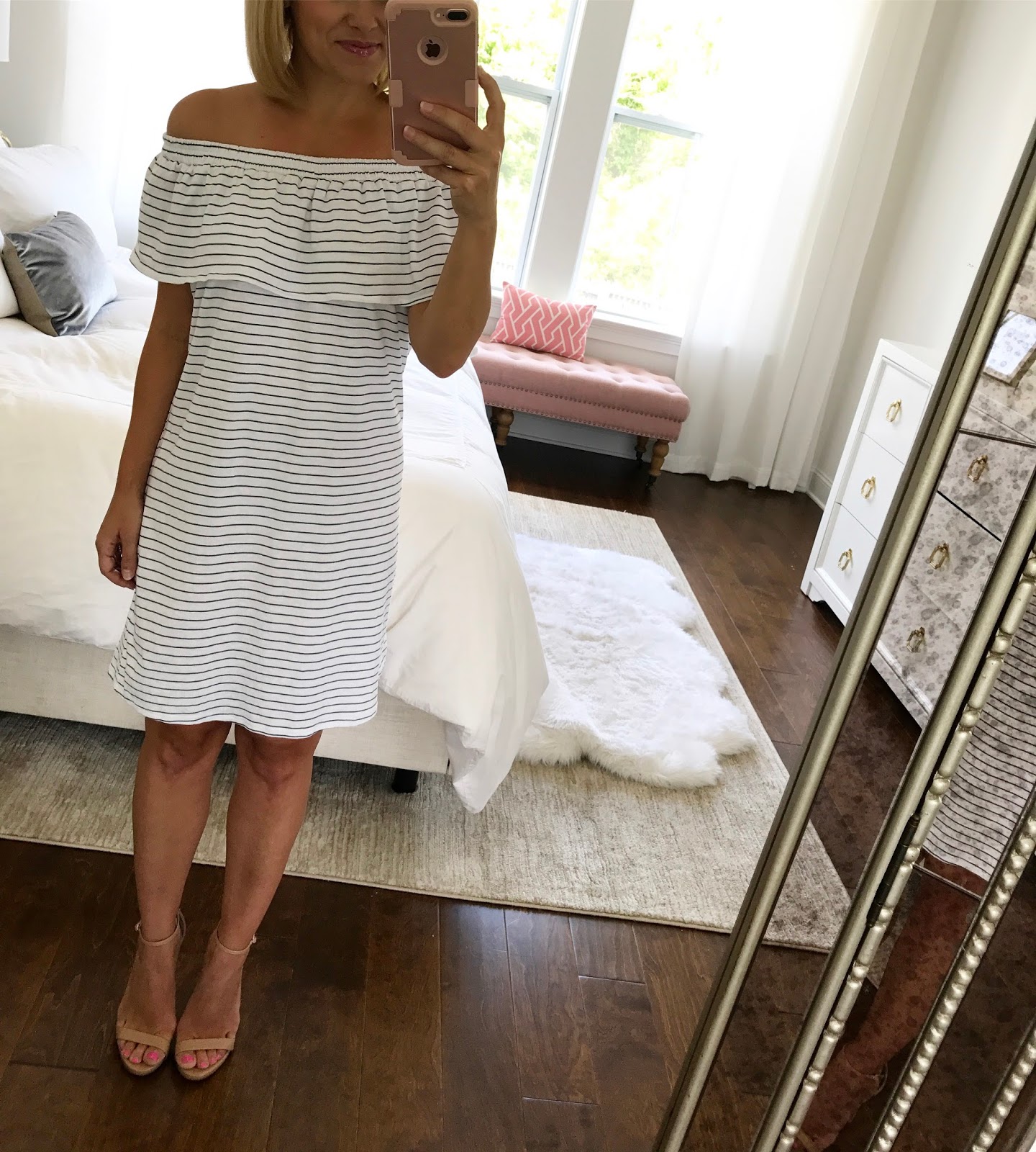 Off the Shoulder Dress (only $49) // Earrings // Wedges