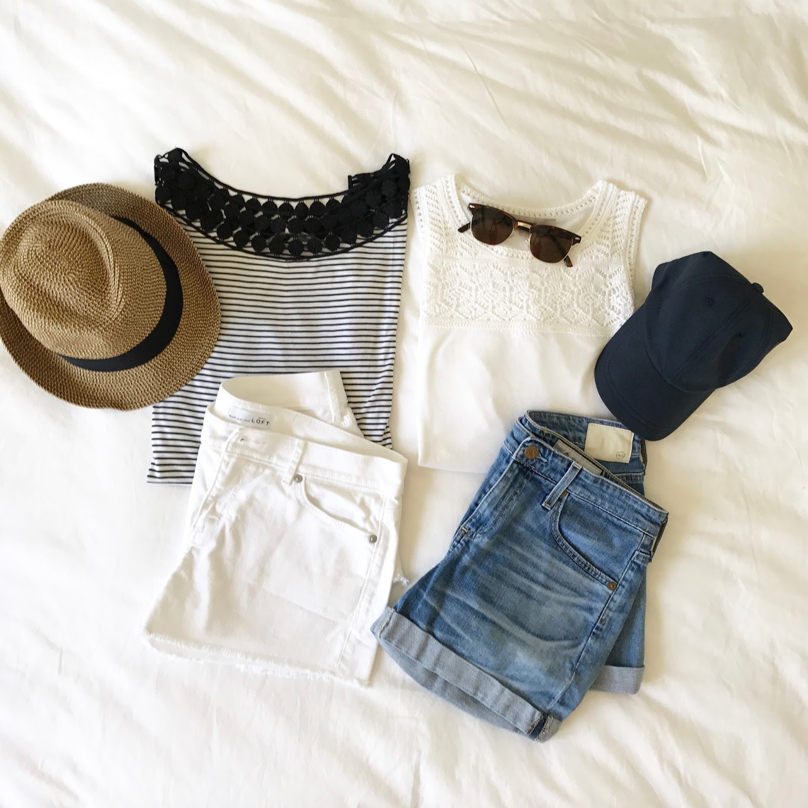 Straw Hat // Stripe Lace Tee (30% off) // White Shorts (30% off )