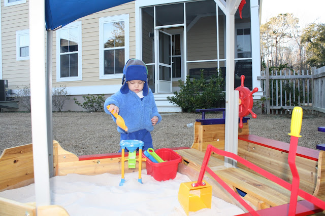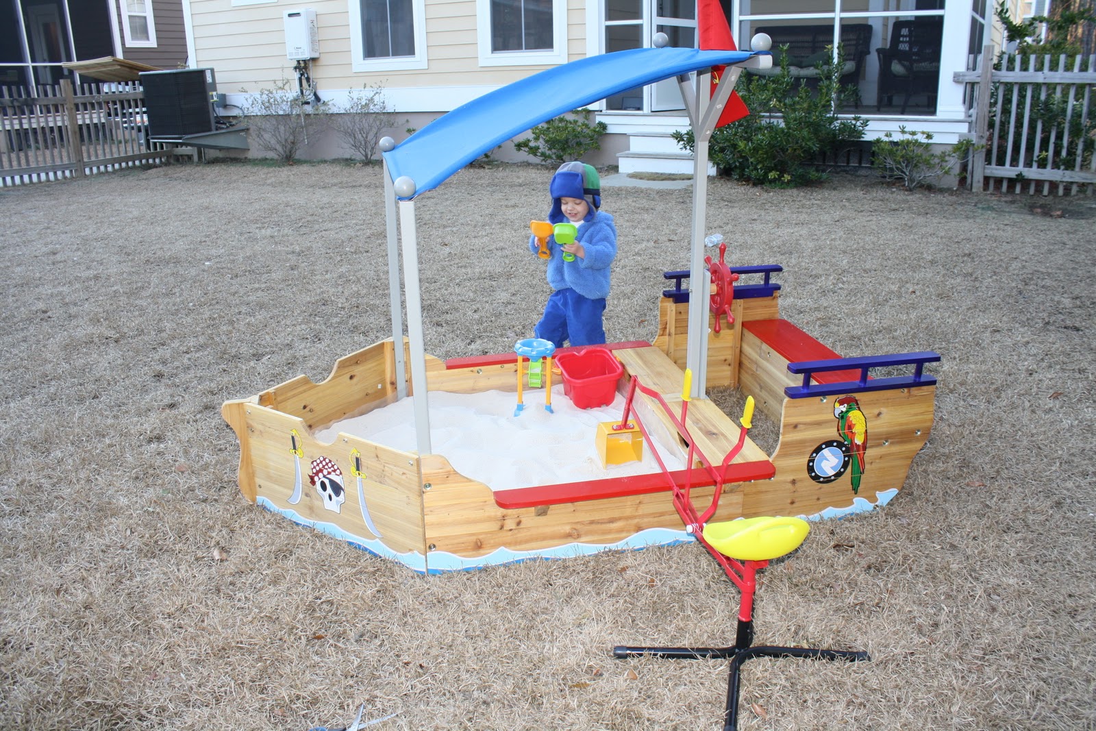 We had a fun Saturday morning  at Chuck E Cheese for Mackennas 3rd birthday! When we came home we put Carson down for his nap, and Todd started on Carsons early birthday present! It took Todd four hours to put together but was obviously worth it! Carson loves his new boat sandbox! I see many sand castles in our future this summer 🙂