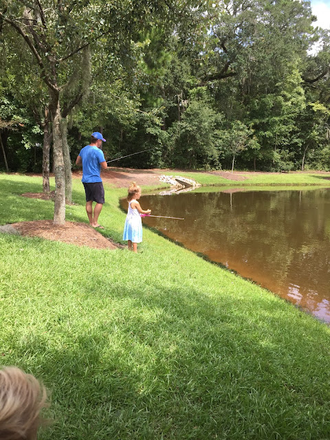 // Then we have the “friendly” gator that lives in our pond that has my mama nerves all a mess!!! I stress every time the three of them go outside to fish. I am not too worried about Carson, he looks for it at all times and high-steps it if he sees it anywhere near the bank. But Taylor, oh Taylor, she declares she wants to pet the gator and “ride on him”. And although Todd makes sure they stay a good distance from the edge of the water, we have him over here telling Carson, “don’t worry, I’ll take that gator down if he comes to close.”?!?! He says this joking because he knows how cautious Carson is, but don’t ever let Taylor hear that! #areyoukiddingme #areyoudrunk
