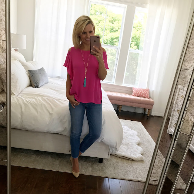 Cold Shoulder Blouse (only $39) // Jeans // Necklace // Earrings // Pumps