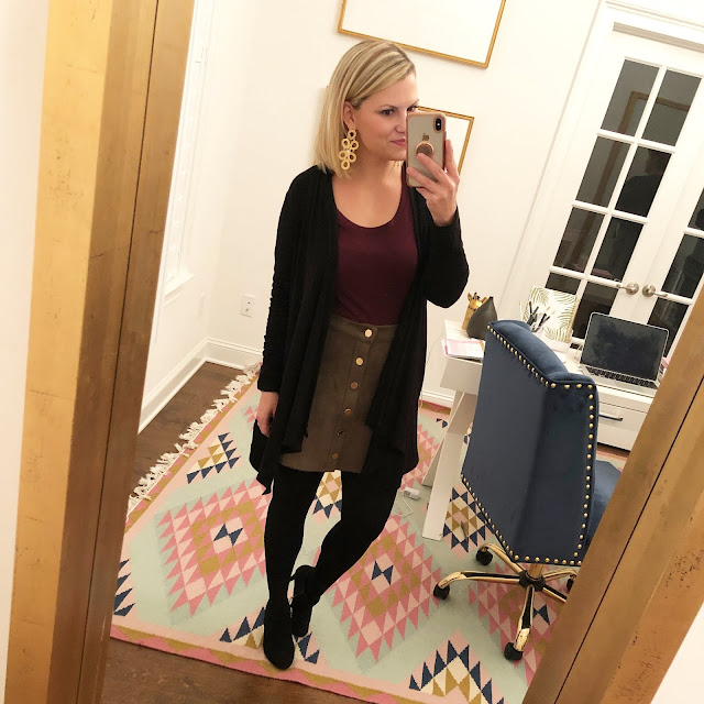 Thermal Tights with Inner Brushing // Suede Button Close Mini Skirt // Black Cardigan // Similar Booties
