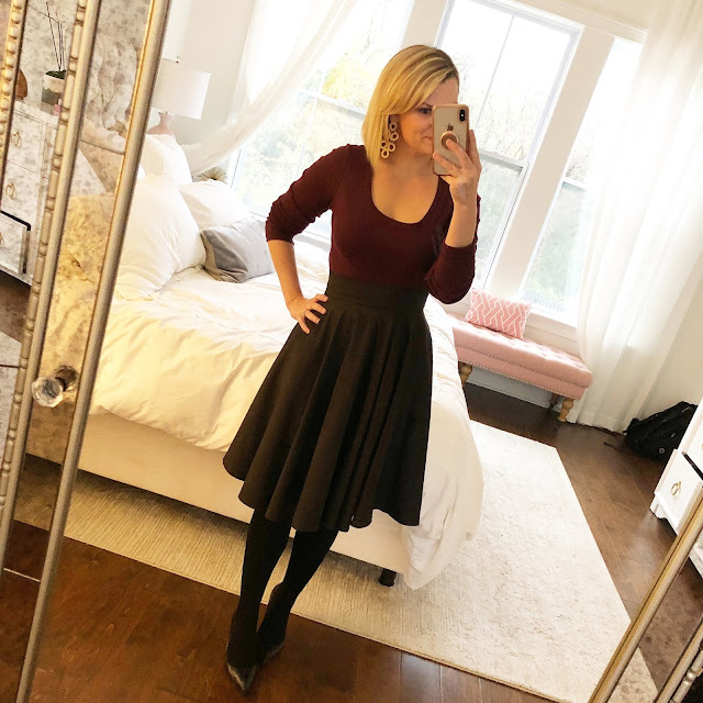 Tee runs tts, and for reference, I’m wearing a small. The skirt also runs tts and I’m wearing that in a small as well.
