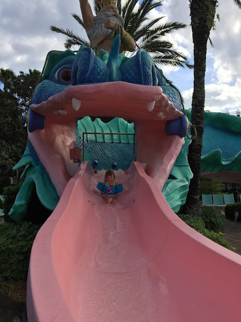 Disney Port Orleans- French Quarter around 8:00 pm. We chose this resort because it was the same exact resort that I stayed at with my family when I was seven years old (24 years ago). I have the happiest, most vivid memories of this vacation with my parents and my brother. So, I thought it would be neat for our family to stay in the same place. It was exactly the way I remembered it from when I was a child. From the rooms, the arcade, and my favorite…..the serpent waterslide pool. And of course the kids wanted to night swim when we arrived. Since the pools are heated, we happily obliged.