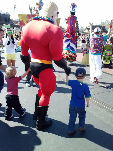 The characters were his jam. He was is complete awe every time we got to “meet” one of them. He showed no favoritism,and was equally excited to greet them all with big hugs. I will say the kiss Jessie gave him and the Incredible holding his hand while they danced together in the parade was the all time high for him 😉