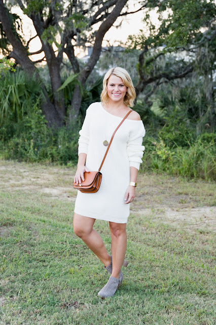 Sweater Dress (only $42) // Ellia Booties // Cross-body // Necklace // Cuff