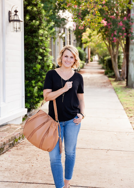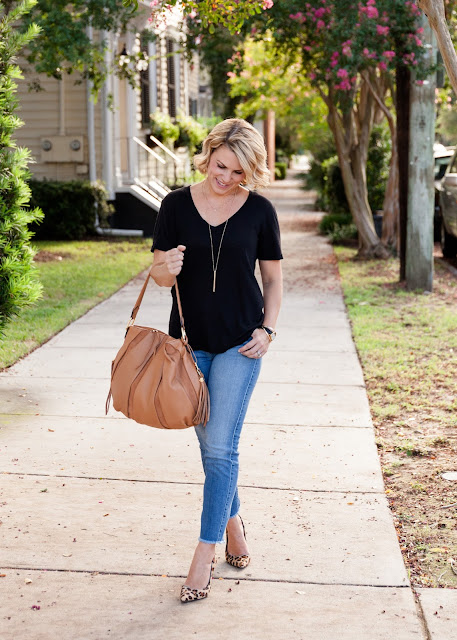 I paired my new hobo bag with one of my go to casual looks…jeans, a comfy tee, and pumps. I also love the way the bag and leopard pumps really coordinate and pop with a black top and jeans.