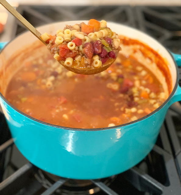 I made the easiest Pasta E Fagioli last night for dinner and everyone in our house LOVED it! Plus, it made a huge pot and I was able to save a container for leftovers while also freezing an additional container for another night. So technically, one pot made dinner for three nights! Also, if you don’t have a dutch oven, I highly recommend the one we have and it’s currently on sale. We have the 5qt, but I just ordered the 7qt by the same brand in the cool gray color.