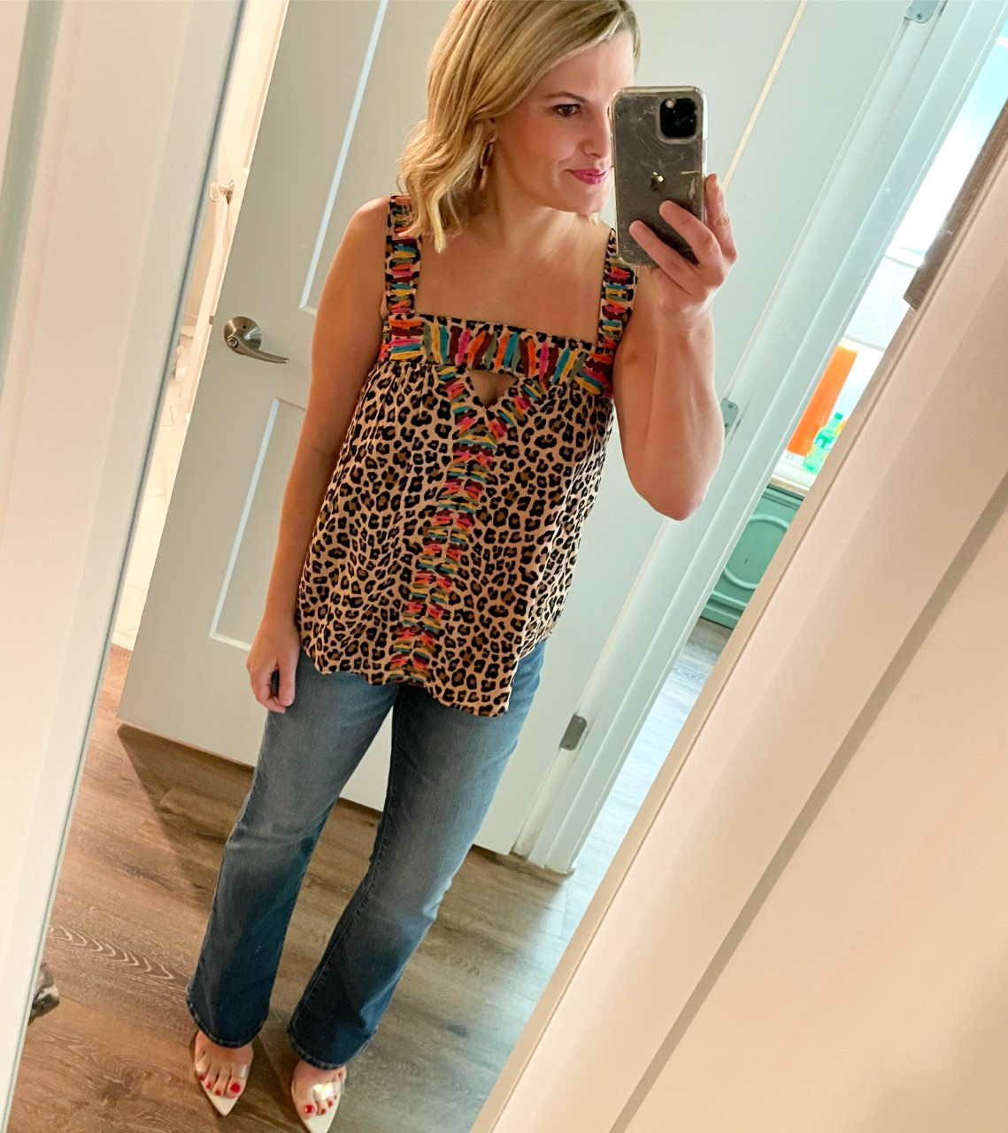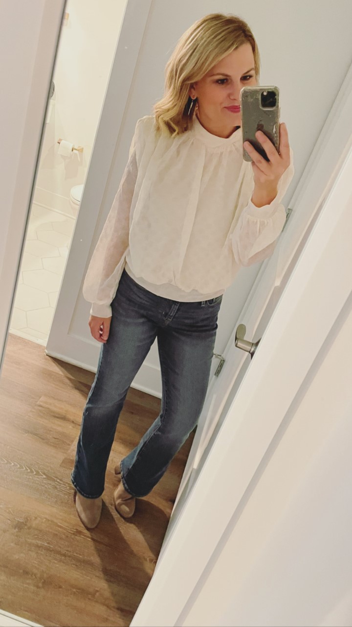 Top run large so size down, and for reference, I am wearing it in the xs. The jeans runs pretty tts and I am wearing them in a size 4 short.