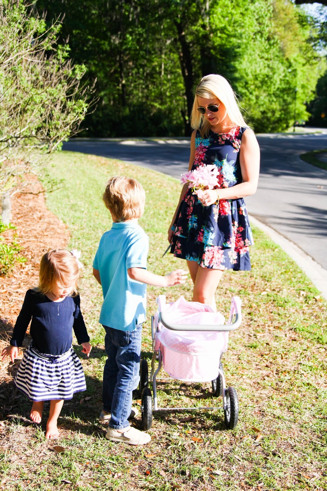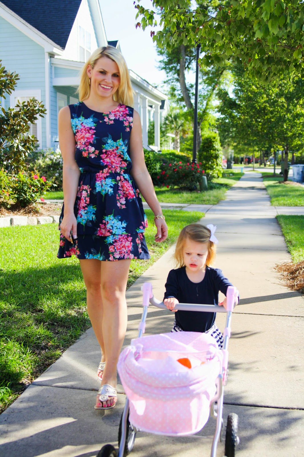 Such a cute little family 🙂 I love her stroller- cutest thing ever! Loving your dress too- I'm huge on florals this year!