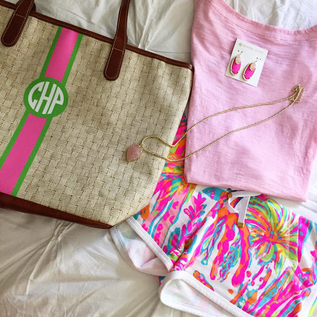 Clearly I have no issues with the color pink 🙂 So many good things about this picture! Number one, my Zippered Savannah Tote is making me so happy! I love the bright color monogram for spring, and the new basket weave is so fun for summer! Have you guys checked out the new Kendra Scott color bar!?!? It’s really cool, you can custom create your own piece of jewelry with different stones and silhouettes!! And last, these Lilly Pulitzer shorts are the best thing since sliced bread!