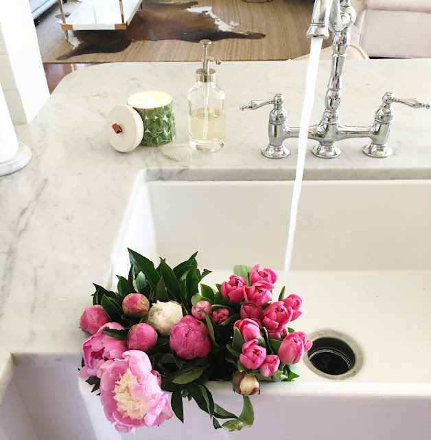 // While I was grocery shopping on Monday I picked up the most gorgeous blooms. Harris Teeter now has peonies on sale…$6.99 for a bunch of three! I wrapped the tulips in a pretty tuile bow and took them to Taylor’s teachers. Peonies and tulips are my favorite flowers, the only ones that even come close to competing around here are hydrangeas 😉
