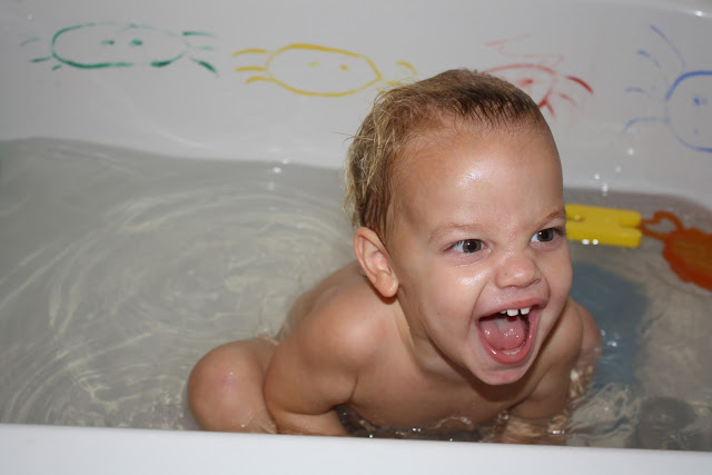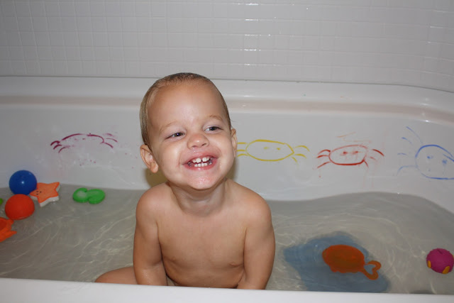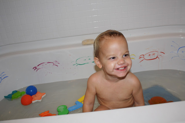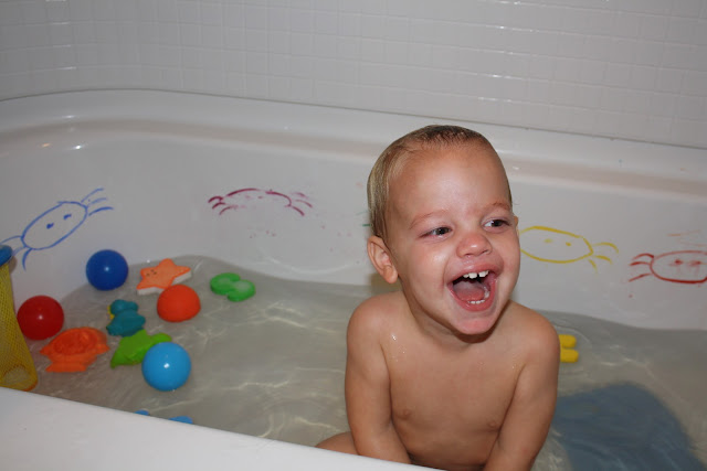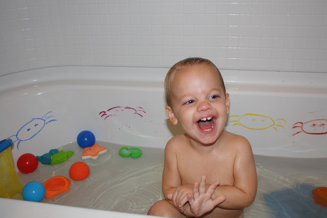This is Carsons Favorite song right now, so Sunday while Todd was giving him a bath I came in to play with them. We bought Carson this neat PBK bath crayon for the tub, and with it he insisted that I draw him spiders along the sides of the tub. After the first one he kept saying more spiders mama, more more spiders please. So after we filled the tub with colorful spiders, he still wanted more spiders please, and was getting upset that no more would fit. That is when Todd pretended to start crying, and I have never I repeat never seen my child laugh so hard. He had forgotten all about the spiders, and all he wanted was daddy to keep crying, I am not sure why my child thought this was so funny, but he did! Todd and I could not stop laughing at him laughing so hard. Is there anything better that watching your child laugh so hard they cant breath, yeah I didn’t think so!