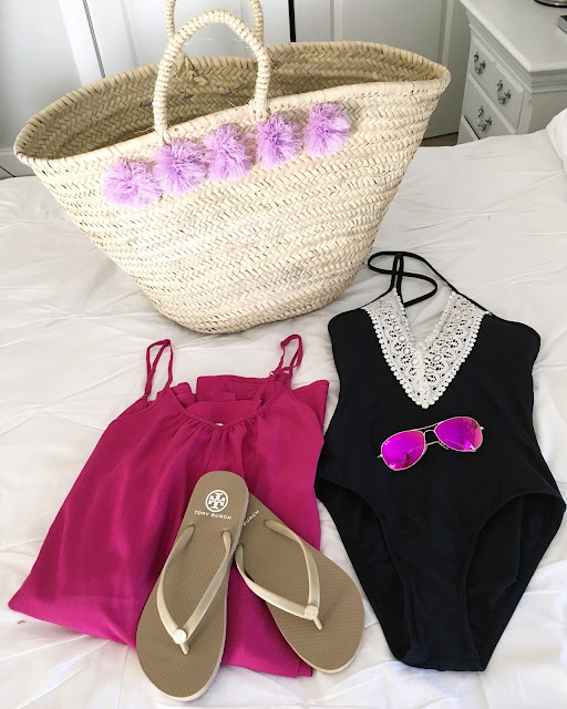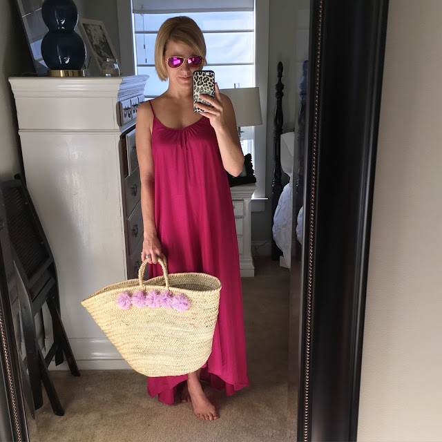 Maxi Dress– runs large so size down!! I am wearing the xs and still have lots of room. // Tote (sold out) here with different color poms // Sunglasses – perfect for a smaller face!
