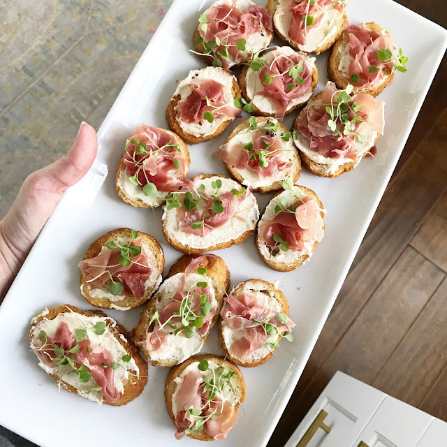 It is crostini bread (I picked these up at Whole Foods in the bag), white truffle cheddar spread (also found at Whole Foods with all the other cheeses), prosciutto, and micro greens sprinkled on top.