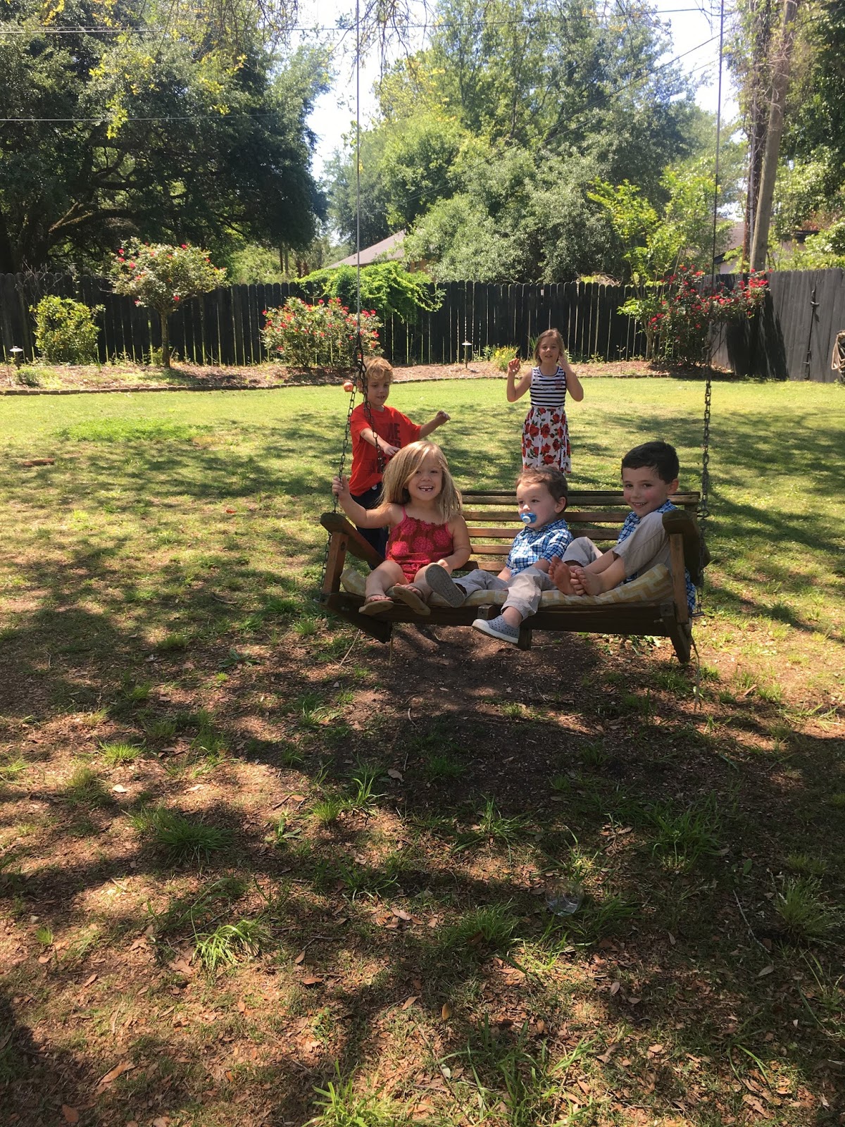 // Then on Sunday, the kids and I headed to a baby shower to celebrate our sweet friend Erin and their soon to be second baby boy!! Because most of the guys were on the camping trip, they decided to make the shower kid friendly. My girlfriend that hosted the shower has the biggest backyard, full of fun toys for the kids, so they played outside while we mingled and opened presents.