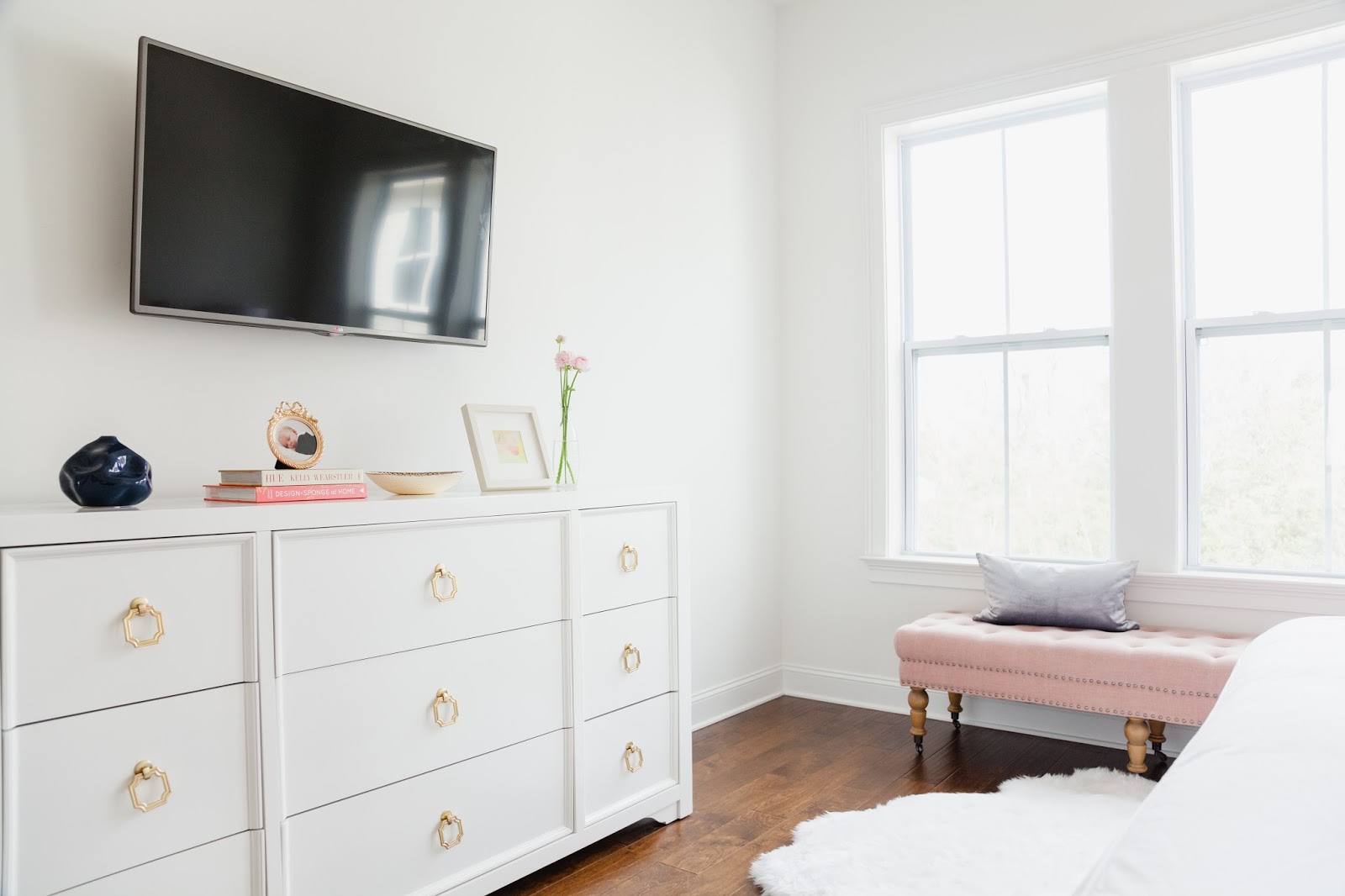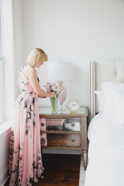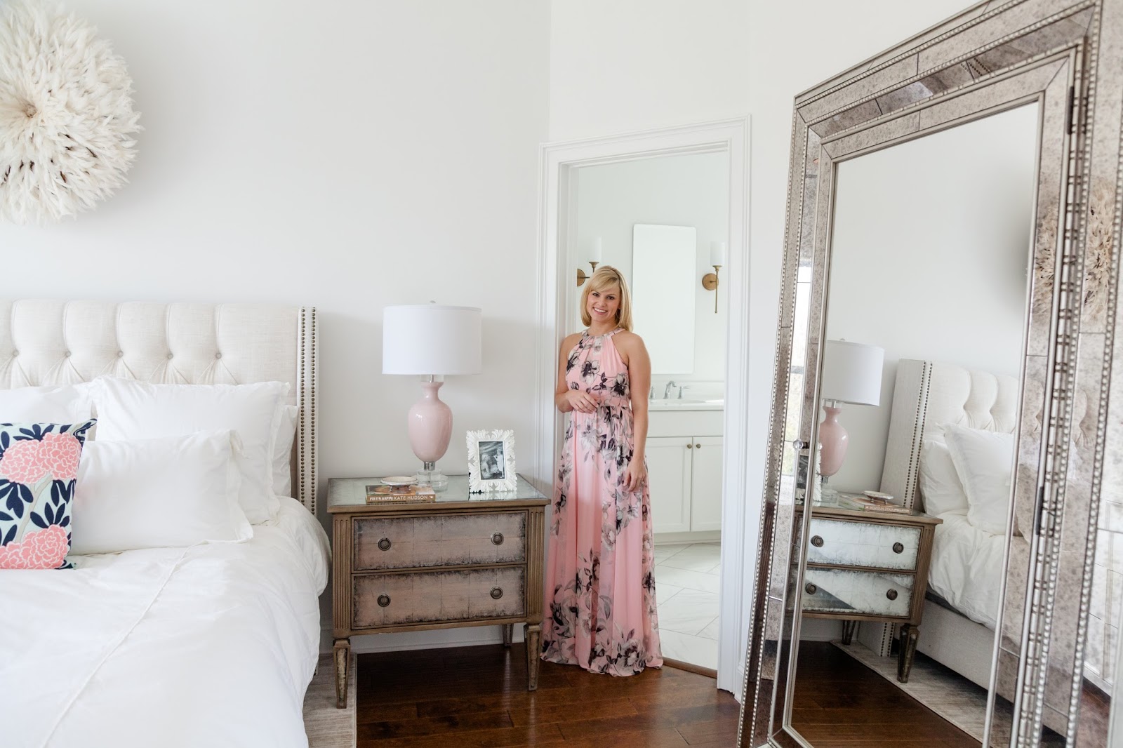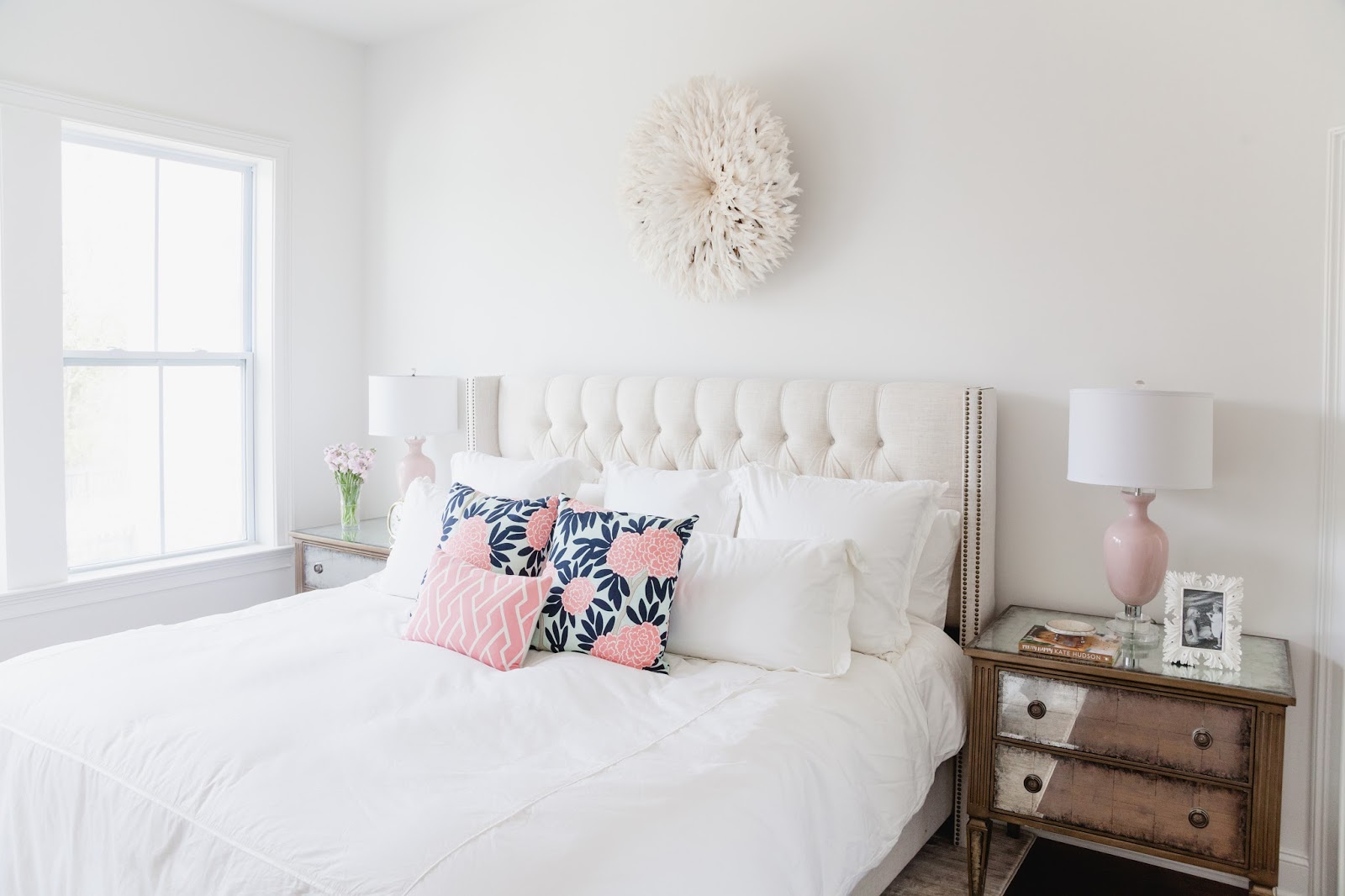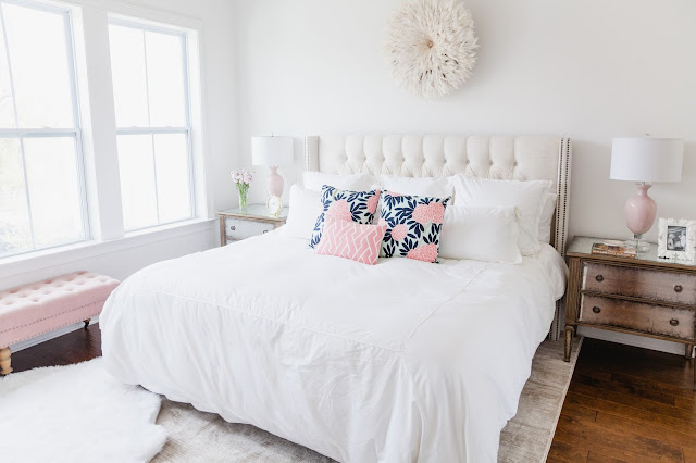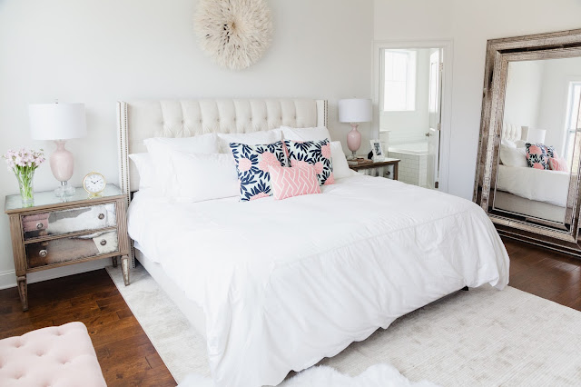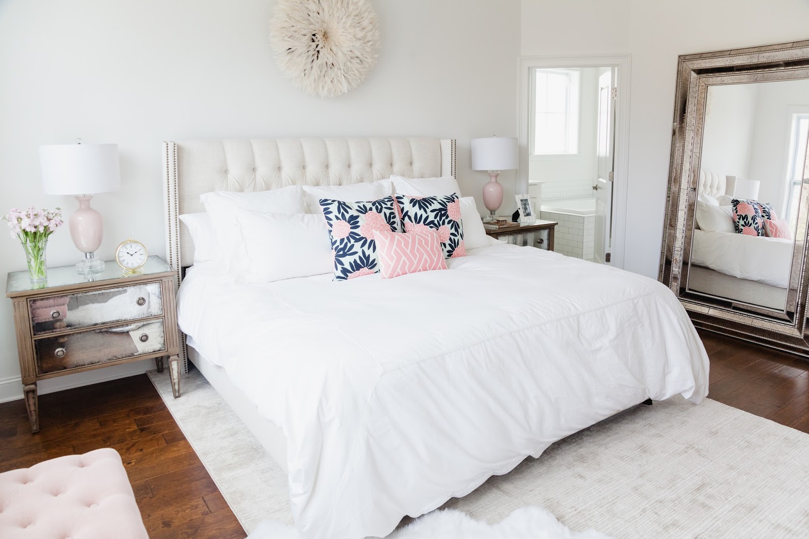 In our last house, the one bedroom that never felt complete was our master bedroom. At the end of the day, it’s supposed to be that one room that Todd and I both need to feel calm and relaxed in, but honestly, it just never really reached that point. So, as soon as we started building our new house, I told Todd, before we design and decorate any other room, our master was our first priority. I don’t think he was even listening, or cared at the time, but I know for a fact he enjoys it now (except the pink, but that was a war I knew I could win as long as I gave him a comfortable, clutter free space).