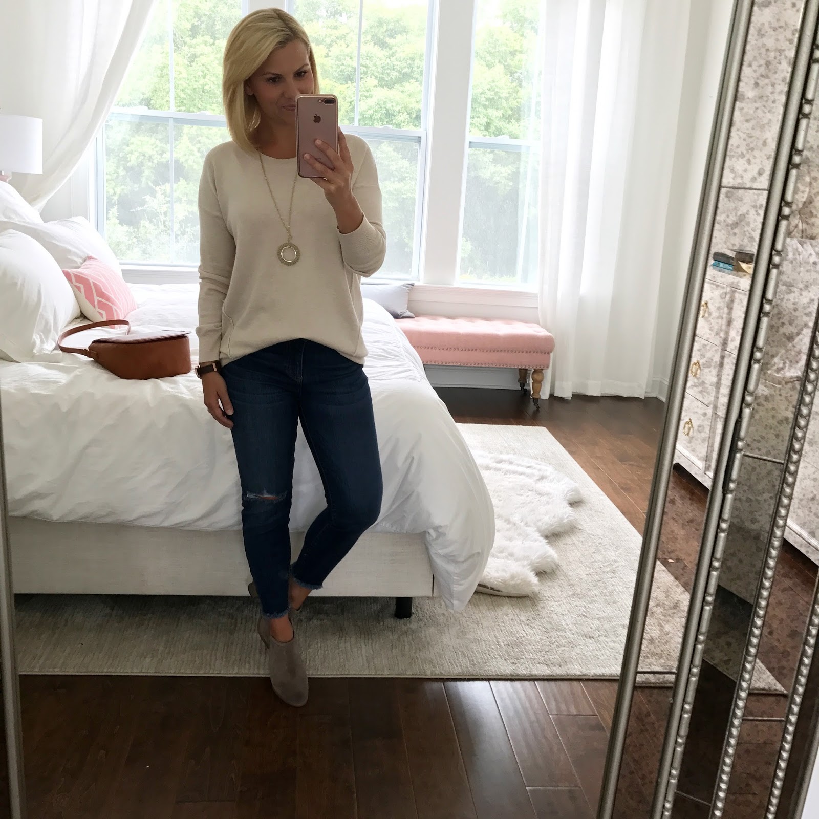Sweater and jeans run tts. I’m wearing the xs and a 2 regular in the jeans.