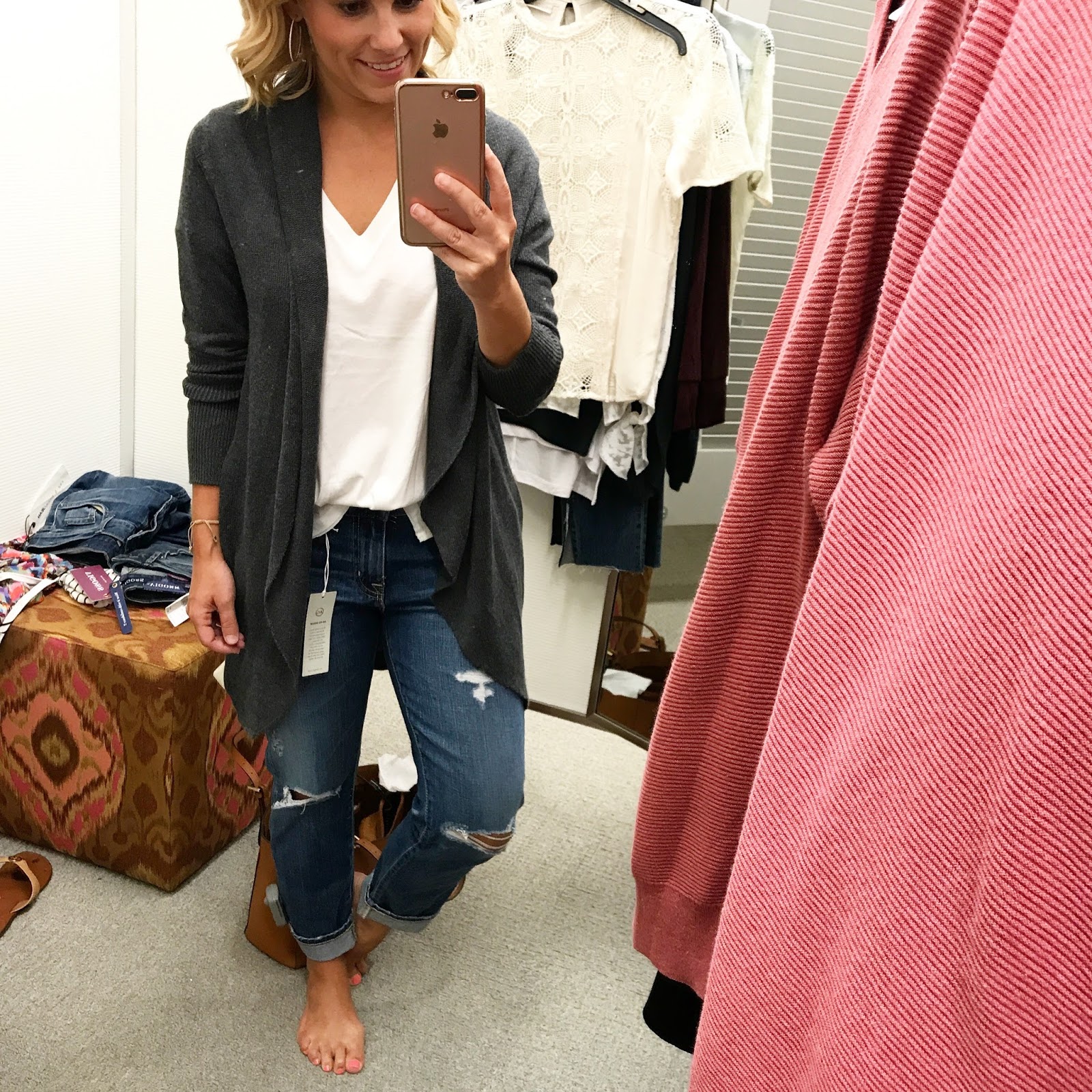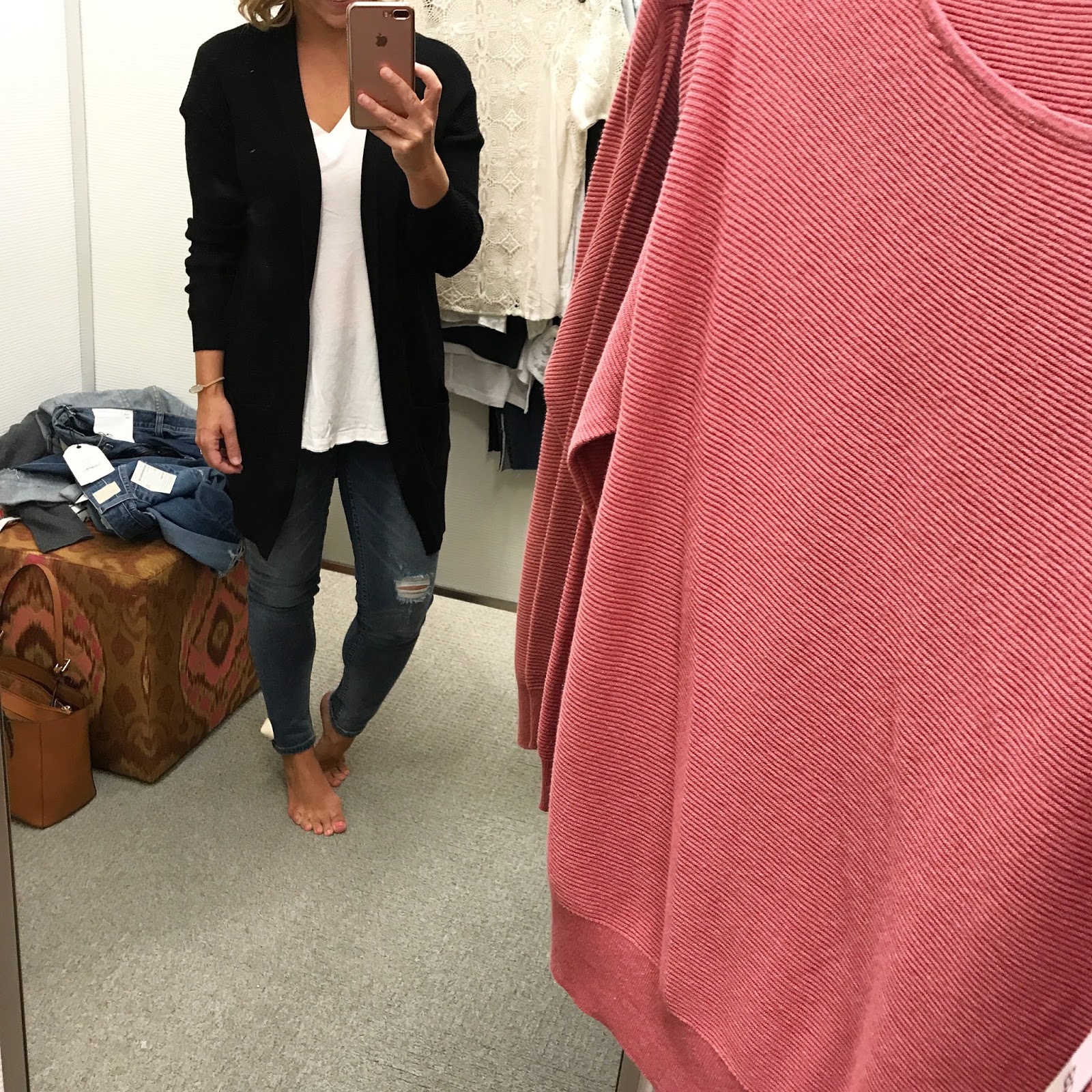 Again, cardigan and tee run a little big, while the jeans run small. For reference, I’m wearing the xxs in the cardigan and a 26 in the jeans.