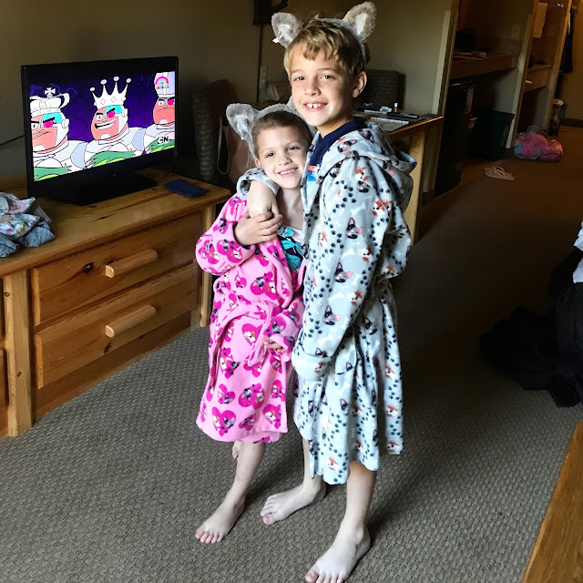On Friday morning, this was them ready to rock and roll by 8am…and the water park didn’t even open until 9am…ha! And thanks so much to one of my readers who suggested that we purchase warm robes for them to wear when they got out of the water. These robes were a lifesaver and kept them warm when we got out to visit other areas of the lodge. I purchased them here and here off Amazon for anyone wondering. And Carson has still been wearing his every morning at home while he eats breakfast 🙂