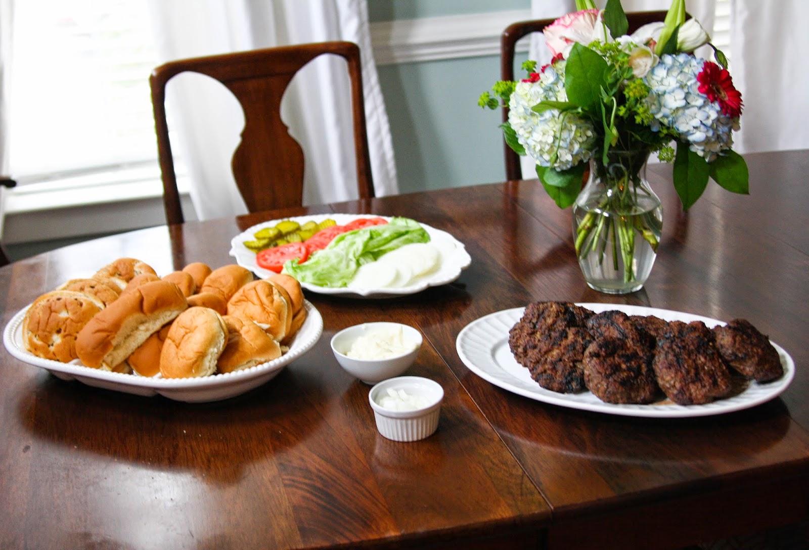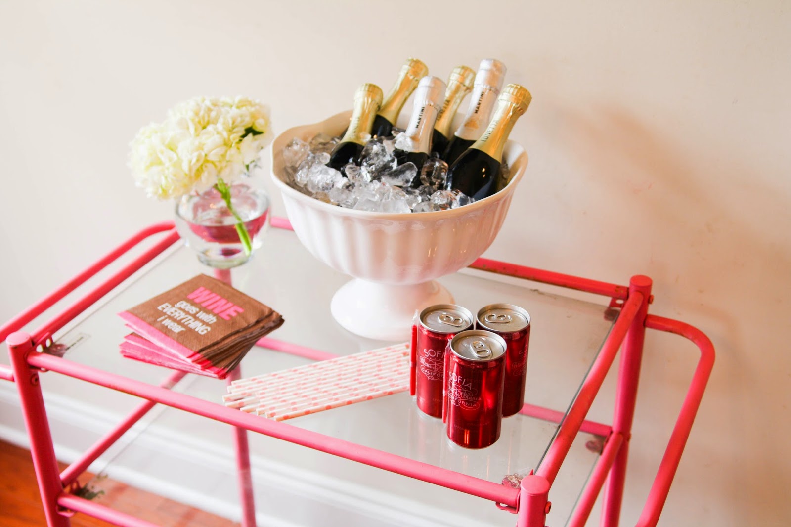 On Saturday Todd and I hosted a cookout at our house. We invited some of the neighbors over and kept things real simple with burgers and dogs. I did, however, whip up a little champagne bar 🙂 I love any excuse to bust out my pink bar cart.