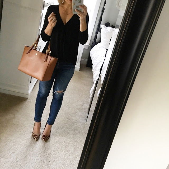 Surplice Top // Jeans also here // Necklace // Pumps // Leather Tote