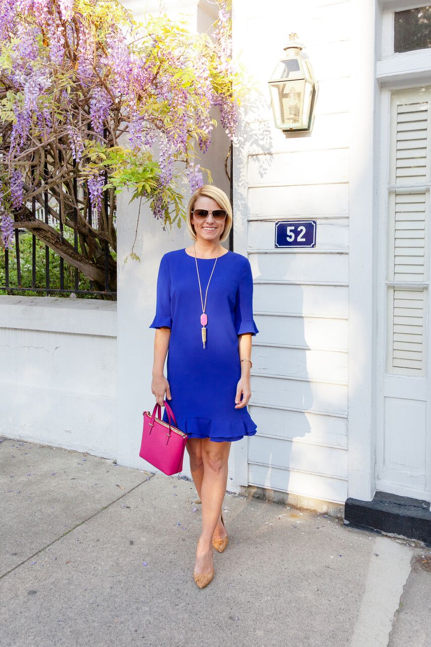 But seriously, how fun is this dress!?!?! I was sold when I saw the ruffle hem and ruffle sleeves. And another bonus is that it comes in seven different colors, petite and regular sizing, and it won’t break the bank at $138! For sizing reference, it runs tts, and I am wearing the 2 petite.