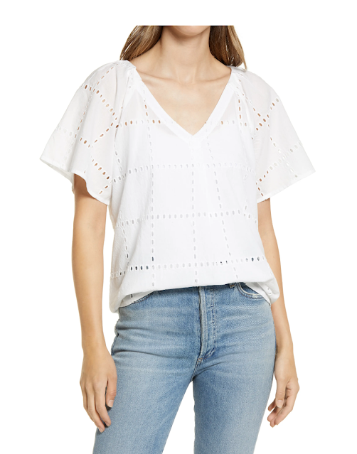 I love that underneath this gorgeous blouse it’s a comfy tee material. White eyelet is one of my favorites and this would look so cute paired with these cuff jeans shorts!