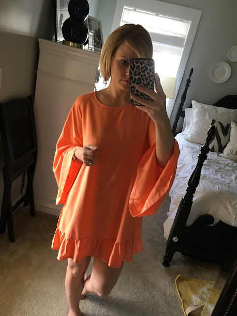 This is the cutest dress ever and all sizes are almost all GONE!!! This dress fits on the larger side, it’s not near as short as it appears on the model! I would go down one size from what you normally wear! This dress is also available here too!