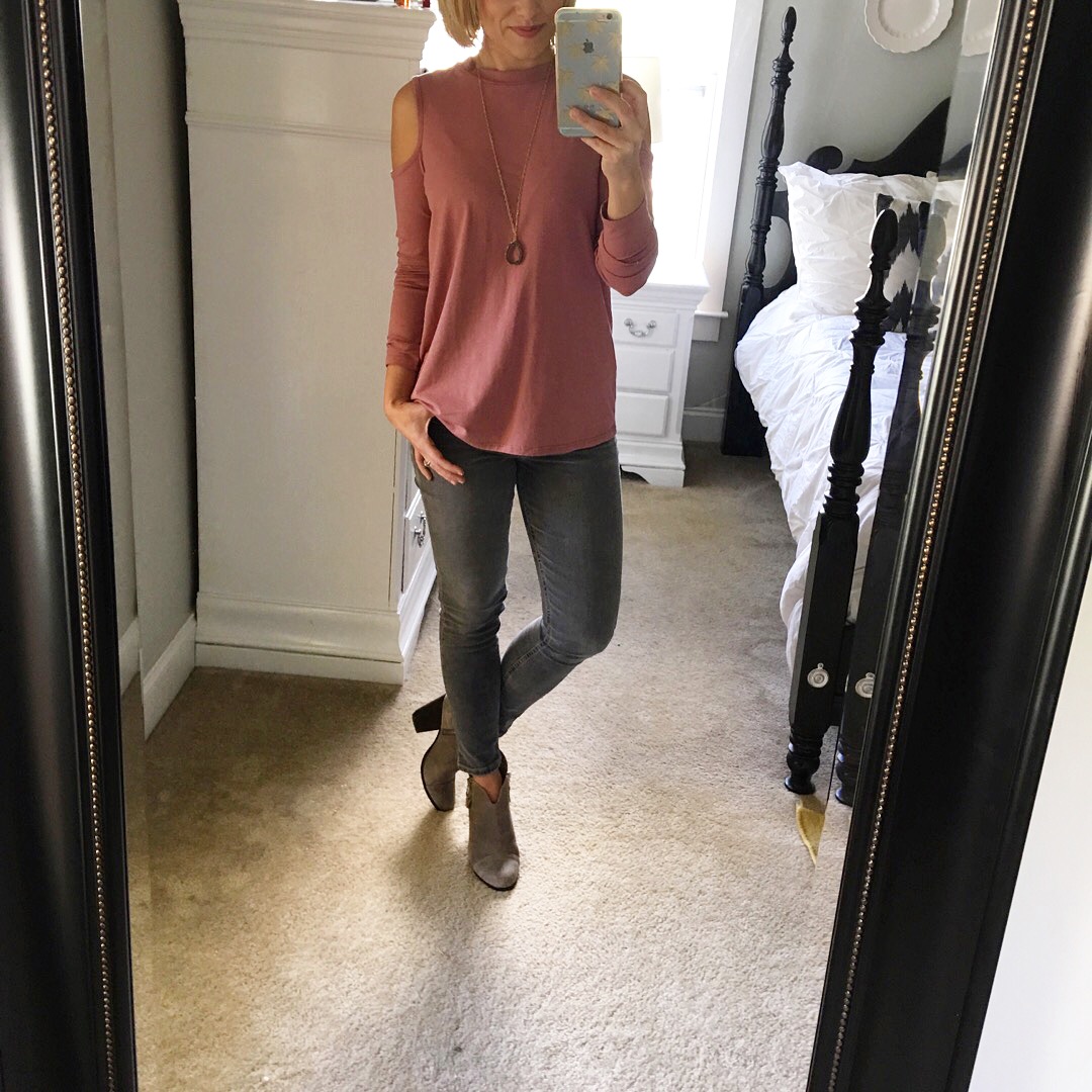 // And last, I wanted to share this outfit I wore on Sunday. These jeans are so awesome y’all, and I can’t get over how soft this cold shoulder tee is! Jeans runs small, so size up one or two sizes depending on how you like your fit, and the shirt runs tts!
