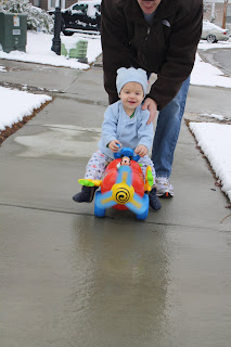YES!! We got snow, and it was awesome!! This is the first time in over 10 years that we have seen snow in Charleston. It was so beautiful Todd and I fixed a cup of coffee, turned on the fire and watched out the window and it feel to the ground. Saturday morning we got up put on what snow clothes we had, and headed outside to play 🙂 Carson wasn’t so sure about it so we put him on his mickey airplane and he was in heaven! Rocky enjoyed it too!
