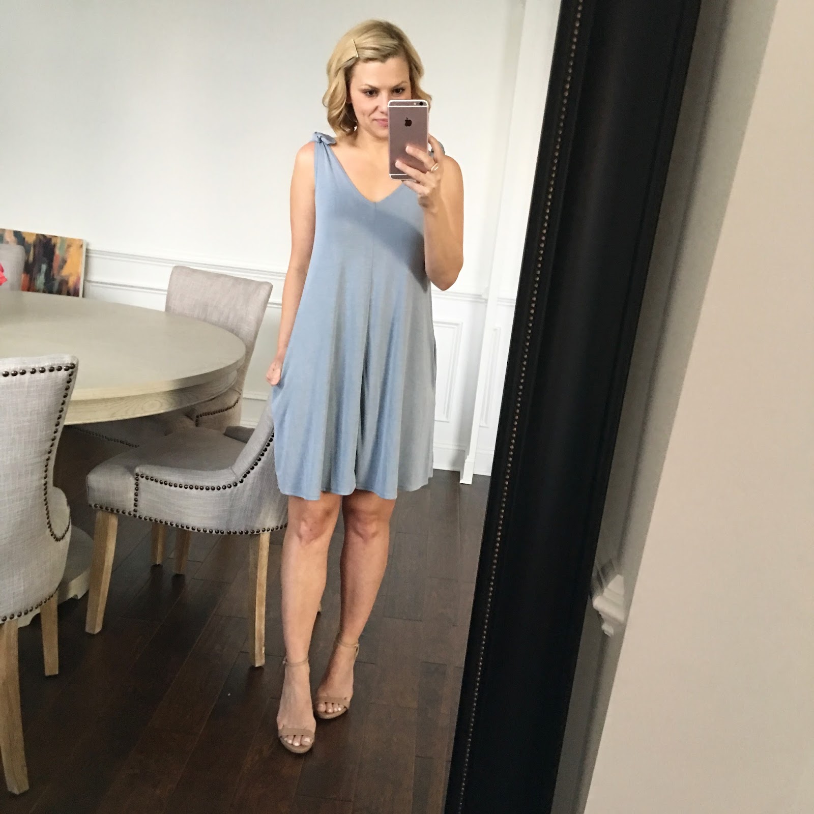 And last, but not least, is this simple and super soft shoulder tie dress. This is my favorite kind of dress to toss on in the hot summers, and added bonus, it has side pockets! It runs tts and I’m wearing the xs.